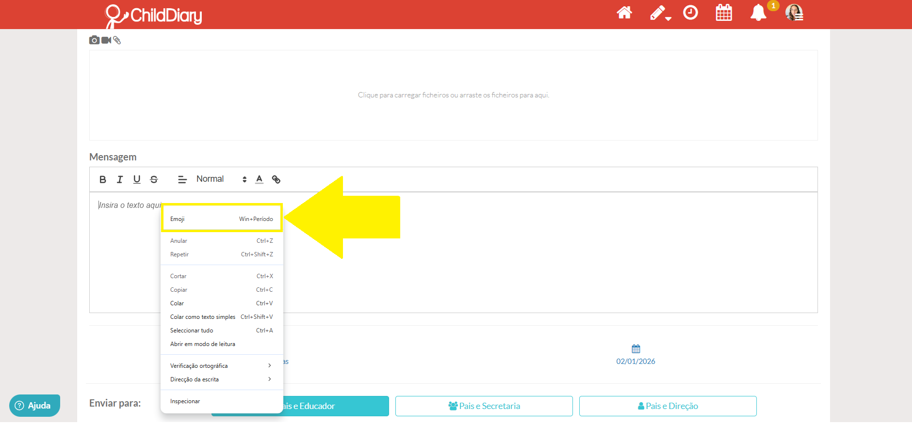 Passo 2 - Em qualquer área de texto, prima o botão direito do rato e selecione "Emoji" OU