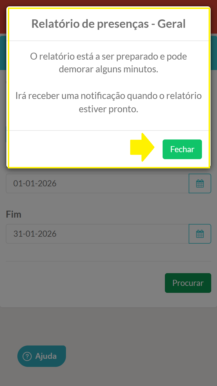 Passo 5 - O relatório ficará a ser gerado mas não precisa de ficar no menu à espera. Receberá uma notificação quando estiver pronto.