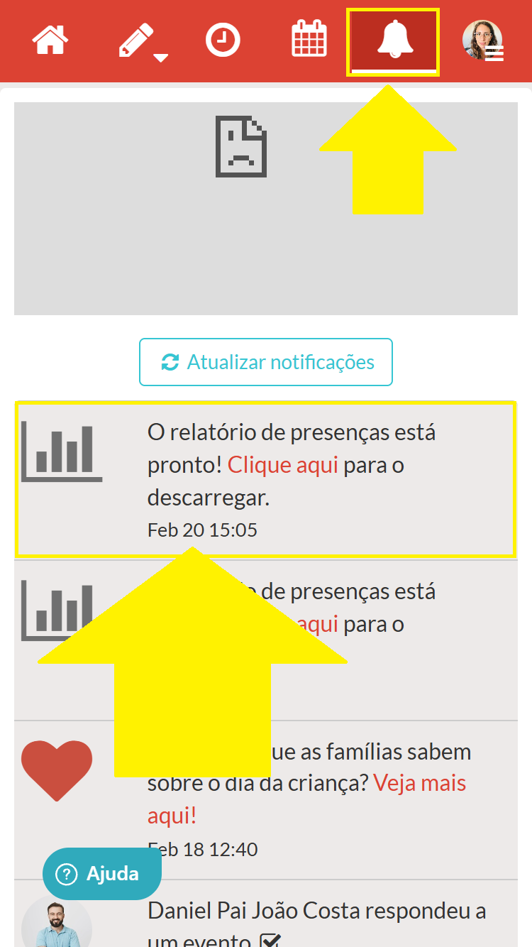 Passo 6 - Clique no ícone das notificações (sino da barra vermelha) e clique na notificação referente ao relatório. O relatório irá para a pasta de downloads do seu dispositivo em formato de documento Excel.